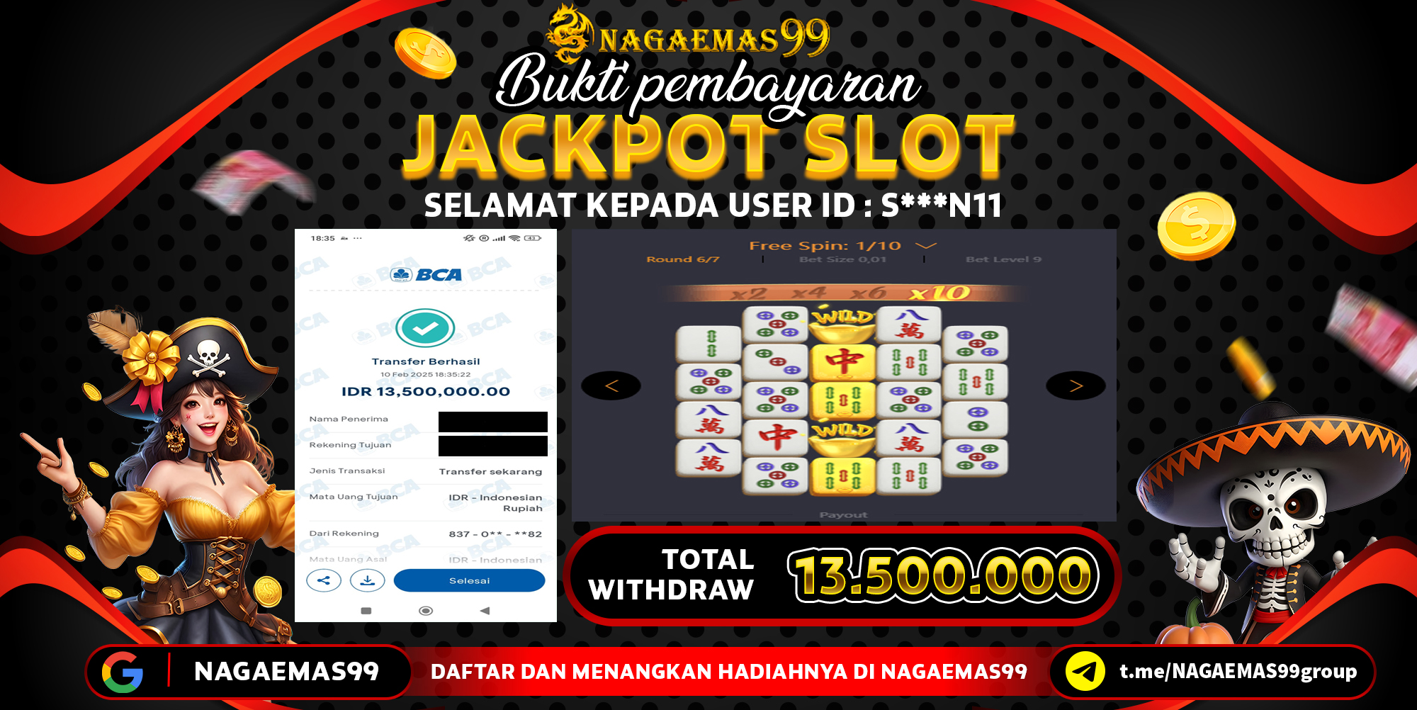 Selamat atas kemenangan User ID : S***N11, yang telah berhasil mendapatkan kemenangan di permainan SLOT MAHJONG WAYS dengan kemenangan sebesar Rp13.500.000,- . Setelah mengisi formulir withdraw, hanya dalam jangka waktu 2 – 5 menitan tim layanan pelanggan NAGAEMAS99 telah berhasil mengirimkan semua saldo kemenangan ke User ID tersebut.