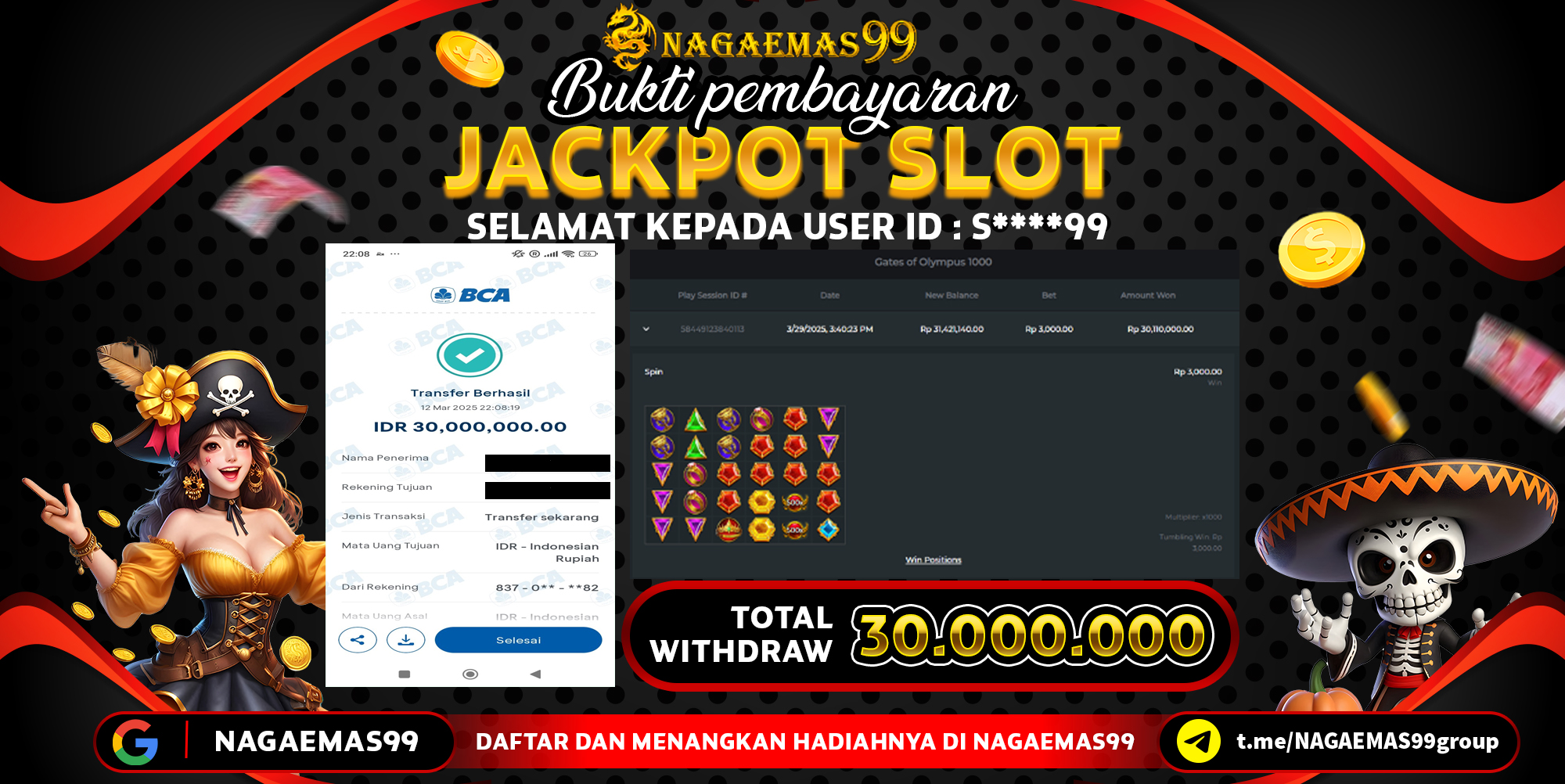 Selamat atas kemenangan User ID : S****99, yang telah berhasil mendapatkan kemenangan di permainan SLOT GATES OF OLYMPUS 1000 dengan kemenangan sebesar Rp30.000.000,- . Setelah mengisi formulir withdraw, hanya dalam jangka waktu 2 – 5 menitan tim layanan pelanggan NAGAEMAS99 telah berhasil mengirimkan semua saldo kemenangan ke User ID tersebut.