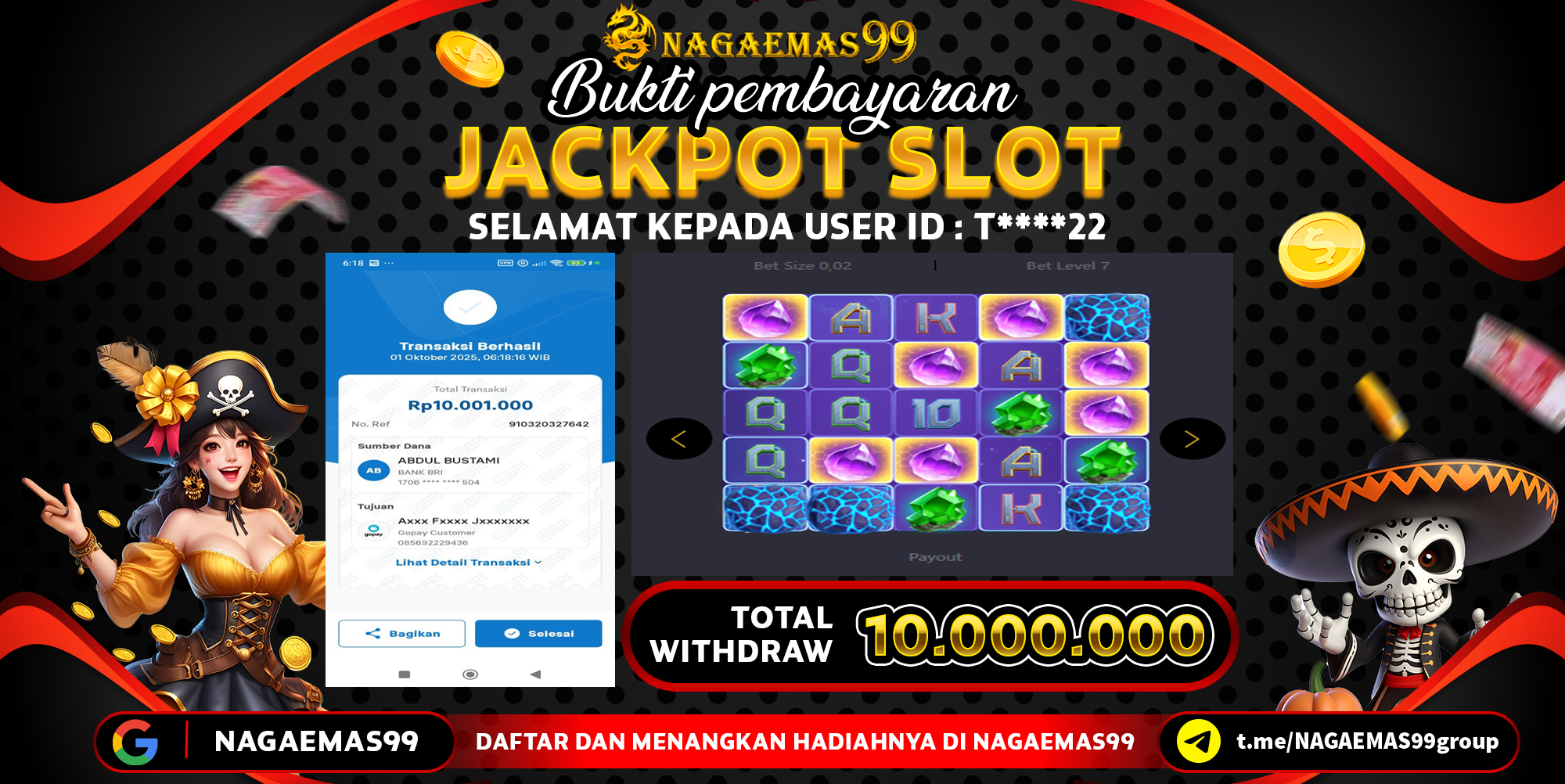 Selamat atas kemenangan User ID : T****22, yang telah berhasil mendapatkan kemenangan di permainan SLOT GALACTIC GEMS dengan kemenangan sebesar Rp10.000.000,- . Setelah mengisi formulir withdraw, hanya dalam jangka waktu 2 – 5 menitan tim layanan pelanggan NAGAEMAS99 telah berhasil mengirimkan semua saldo kemenangan ke User ID tersebut.