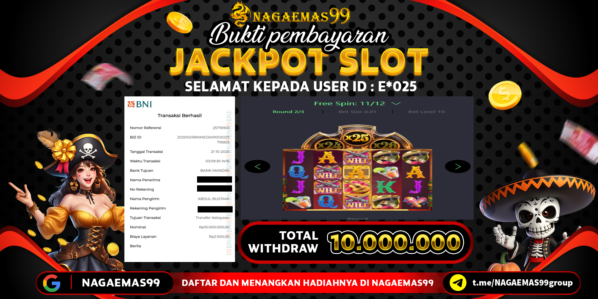 Selamat atas kemenangan User ID : E*O25, yang telah berhasil mendapatkan kemenangan di permainan SLOT WILD BANDITO dengan kemenangan sebesar Rp10.000.000,- . Setelah mengisi formulir withdraw, hanya dalam jangka waktu 2 – 5 menitan tim layanan pelanggan NAGAEMAS99 telah berhasil mengirimkan semua saldo kemenangan ke User ID tersebut.